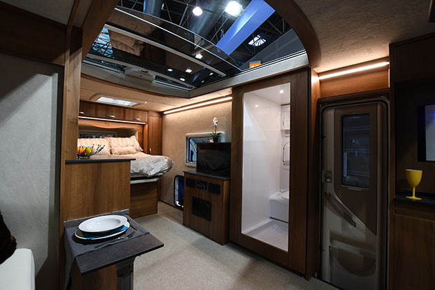 Una delle caratteristiche di design più evidenti e significative del concept motorhome sono gli slide-out, tra i prodotti di punta di LCI sul mercato americano dei veicoli ricreazionali. Il camper presenta, infatti, tre slide-out di diverse dimensioni (una parete interna, un micro slide-out e una Smart Room), a dimostrazione della grande flessibilità d’uso, che trova applicazione in bagno, nell’area living oppure come ripostiglio. Il tetto apribile Sky View e le porte scorrevoli in vetro sono altre due caratteristiche del concept che hanno generato nel pubblico un feedback estremamente positivo. Il Gruppo LCI possiede, infatti, uno dei principali costruttori di coperture in vetro e porte scorrevoli dell'industria nautica.