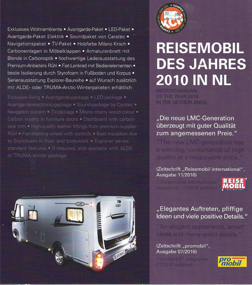 Infatti le maggiori riviste europee - testate di riferimento anche nei paesi nordici - analizzando puntualmente le offerte, le novità e le caratteristiche del panorama costruttori hanno decretato unanime che il marchio LMC - Lord Munsterland Caravan- ha realizzato il miglior compromesso tra qualità - affidabilità - eleganza e prezzo nei propri autocaravan della collezione 2011.