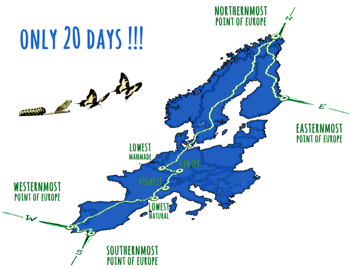 Virmajärvi in Finlandia, al confine con la Russia, sorprendentemente il punto più a Est dell’UE, a causa della forma della terra) per percorrere l'Europa intera, fermandosi in tutti gli altri punti estremi: