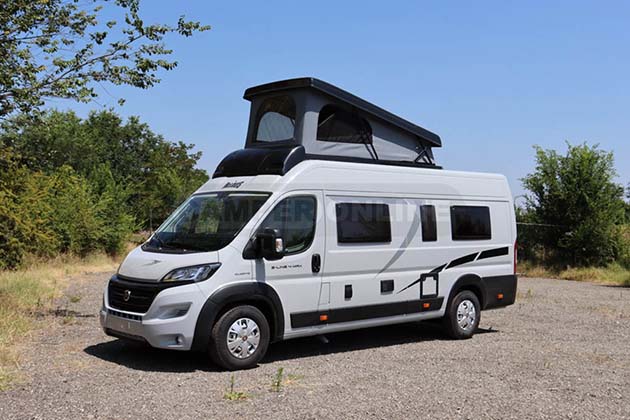 Menfys Prestige propongono in opzione il tetto sollevabile a soffietto, che regala una zona notte aggiuntiva sopra al veicolo.