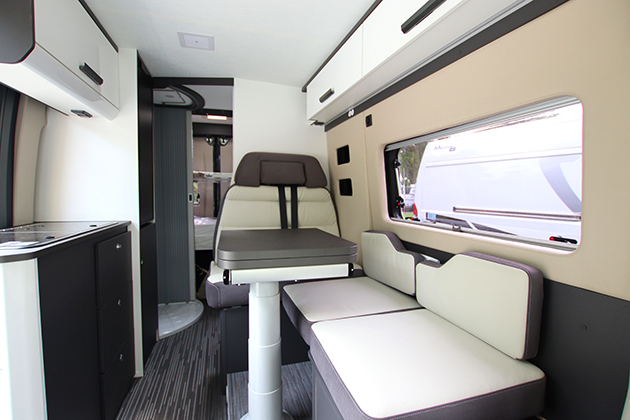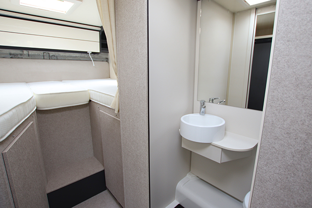 Anche in questo caso abbiamo il bagno con parete rotante, ma la zona notte posteriore mostra un letto matrimoniale trasversale al senso di marcia. Completamente diverso il terzo modello della gamma, l’Mc4 337 da 639 cm di lunghezza. In questo caso il letto basculante, matrimoniale, è l’unico vero letto presente e si abbassa sopra una grande dinette face-to-face (in opzione è trasformabile in letto). Comfort notevole nel bagno posto in coda, che ingloba un ampio armadio posto sopra il gavone.