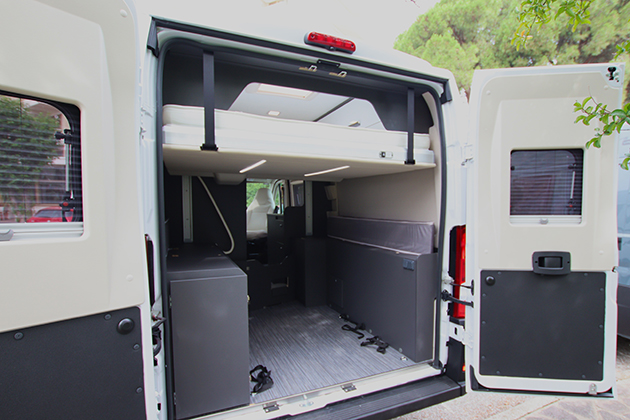 Menfys 6 Maxi punta alla flessibilità della zona posteriore, offrendo un letto matrimoniale sollevabile elettricamente, che permette di variare il volume del vano di carico sottostante. Non deve sfuggire il fatto che questa soluzione era già presente nella gamma van di