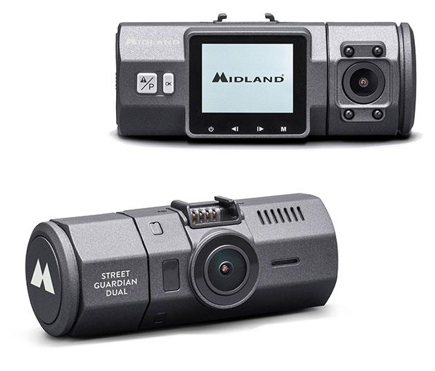 Street Guardian di Midland si allarga. A dar man forte ai modelli “FLAT” e “GPS PLUS”, entrambi meritevoli di attenzione, si aggiunge la nuova “DUAL”. Il nome, ormai chiaro, fa riferimento alla sua doppia videocamera, il plus principale: una rivolta verso la strada, l’altra che guarda all’interno del veicolo. Entrambe dotate di lenti grandangolari.