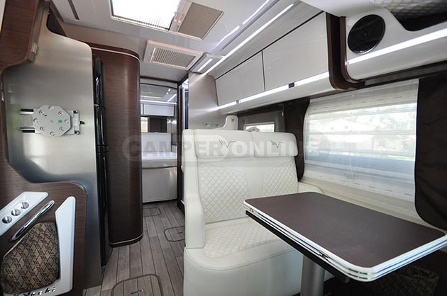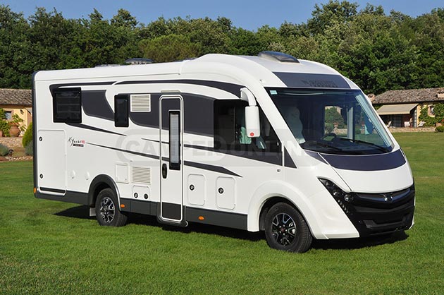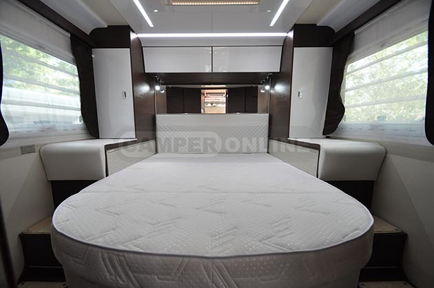 Tre i layout proposti, tutti di dimensioni generose con lunghezza esterna pari a 744 cm: il 79 con letto posteriore a penisola regolabile in altezza e bagno passante, l'85 con letti gemelli e garage e l'89 con letto posteriore centrale, sempre ad altezza variabile, abbinato a un bagno con doccia in locali indipendenti. Più che completa, come da tradizione della casa, la dotazione prevista di serie, con la possibilità di poter richiedere in opzione anche il prestigioso telaio AL-KO, qui abbinato a un vero e proprio doppio pavimento passante.