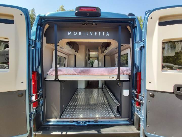E per finire, ecco un van camperizzato, il Mobilvetta Admiral 6.5, e si tratta di un van davvero particolare. Non solo perché ha un arredo raffinato, degno del marchio Mobilvetta, ma anche perché dispone di un letto posteriore ad altezza variabile, un letto basculante, quindi, che permette di modulare l’altezza del garage sottostante. In questo modo, oltre ad un letto di dimensioni maxi, l’