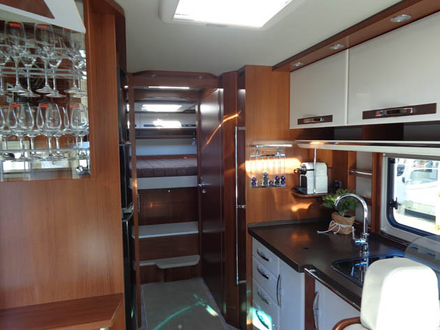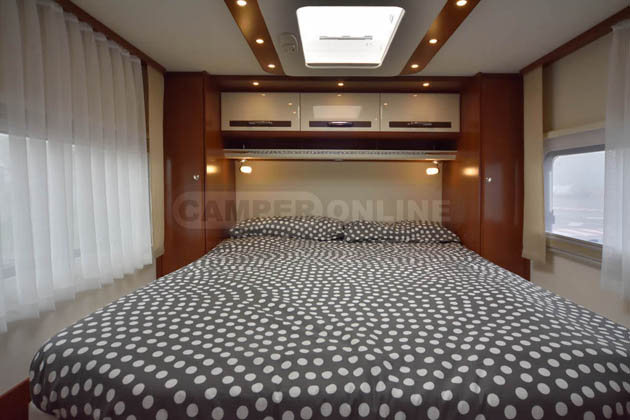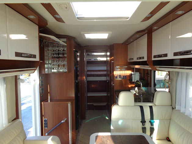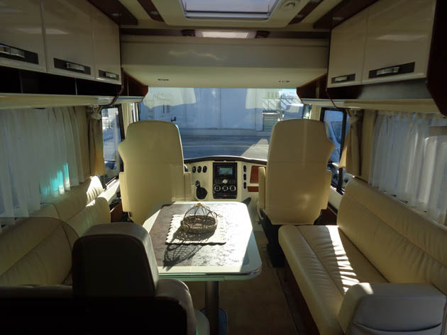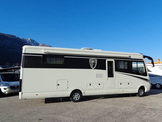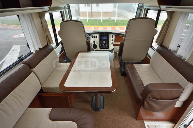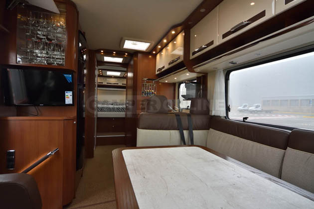Tra gli equipaggiamenti, da segnalare le sospensioni pneumatiche anteriori e posteriori, i piedini idraulici automatici di livellamento in sosta, l’impianto radio Bose con subwoofer, retrocamera a doppia ottica, la doppia tv (da 29” in salotto, da 22” in camera da letto) con antenna satellitare automatica, letto basculante anteriore ad azionamento elettrico, tendalino esterno da sei metri anch’esso ad azionamento elettrico.