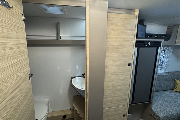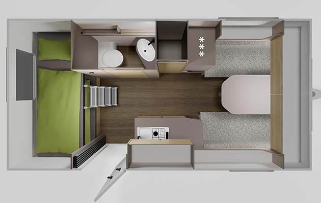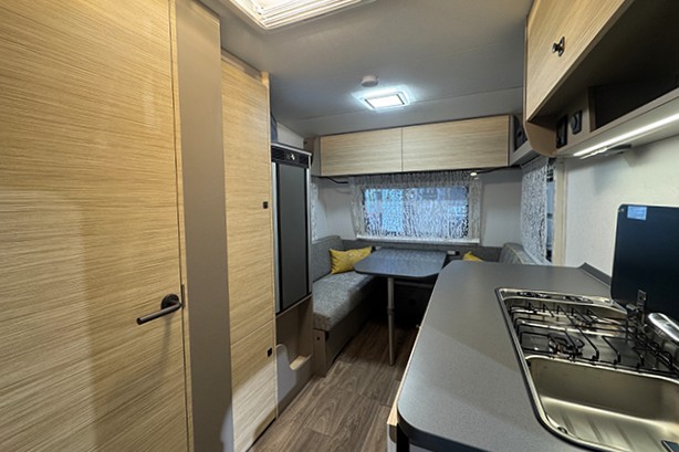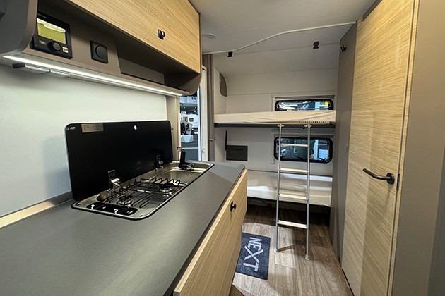 Lo schema abitativo prevede una dinette anteriore a quattro posti, trasformabile in letto matrimoniale, e due letti a castello pieghevoli con materassi EvoPore nella zona notte posteriore. Nell’area centrale dell’abitacolo troviamo la cucina con lavello, fornello a gas a due fuochi e frigorifero a compressore dotato di comoda anta a doppia apertura. Il piano d’appoggio è notevole, pensato anche per una eventuale macchina da caffè. Non manca un bagno completo.