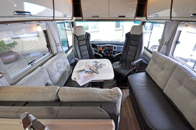 Niesmann+Bischoff. L’esemplare esposto presso l’azienda emiliana presenta, oltretutto, una dotazione i serie veramente “full optional”, completa, tra l’altro, di sistema di riscaldamento Alde a convettori con scambiatore di calore, tre batterie servizi, porta anteriore lato guida, doppio portellone garage, radio doppio DIN, antifurto e sistema caricabatterie/booster/trasformatore/inverter Victron Energy.