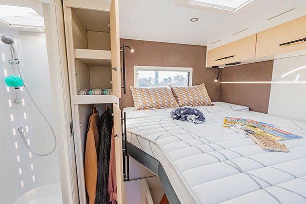 Sfruttabili al loro interno, i gradini ampliano la capacità di stivaggio che può contare su un armadio a tutta altezza e su cassetti sotto al letto. Grazie alla porta del bagno, la zona notte è completamente separabile dalla zona giorno, per una migliore privacy.