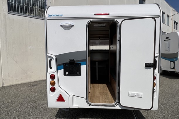 La porta d'ingresso non è laterale, ma posteriore. All'interno troviamo un letto a castello (180 cm di lunghezza) e una dinette trasformabile in letto matrimoniale, oltre a bagno e cucina. Il prezzo si preannuncia basso, nonostante la dotazione sia soddisfacente, comprendendo anche il boiler per l'acqua calda. Sempre di Niewiadow è la