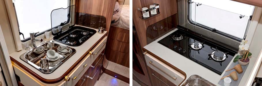 Il modello Thetford Topline 931, utilizzato sugli autocaravan al top di gamma CI Riviera Sinfonia e Roller Team Granduca Magnifico, è un piano cottura dal design moderno e raffinato, caratterizzato da un’elegante superficie in cristallo temperato antigraffio di colore nero e tre fuochi in linea in grado di accogliere rispettivamente pentole fino a 240, 200 e 280 mm di diametro. I fuochi sono dotati di termocoppia di sicurezza e di accensione elettrica automatica e sono in grado di erogare una potenza complessiva di 5 kW. Il coperchio in vetro temperato è diviso in due parti così da consentire la massima versatilità d’uso e permettere di organizzare al meglio le superfici di appoggio.