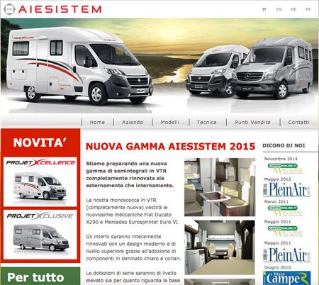 E’ on line il rinnovato sito Aiesistem, con tutte le novità della stagione 2015, sulla rete di concessionari e sulle offerte in corso (in questo periodo continuano le promozioni con offerte lancio sui nuovi modelli con svariate possibilità di personalizzazione) ma, in primis, tutto ciò che riguarda le due nuovissime gamme di semintegrali in monoscocca di vetroresina: i Projet Xcellence su Fiat Ducato X290, e i ProjetXclusive su meccanica Mercedes Sprinter Euro VI.
