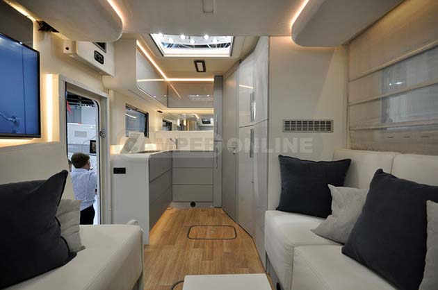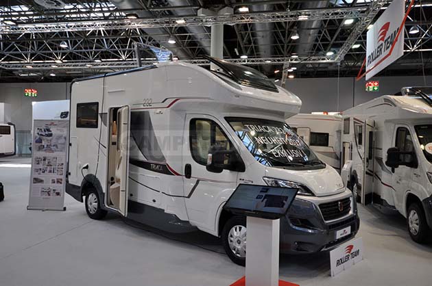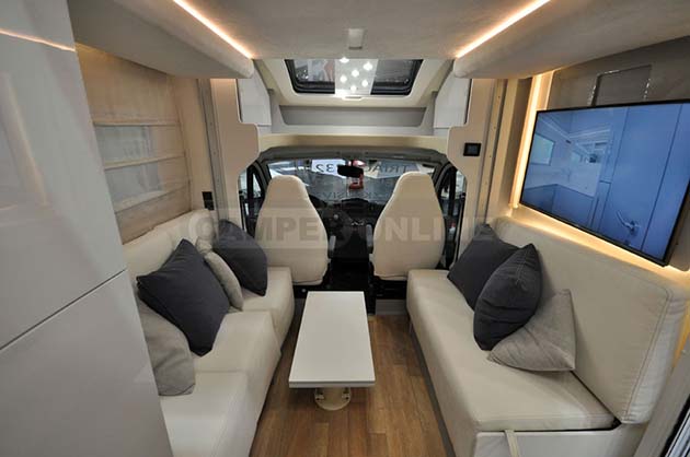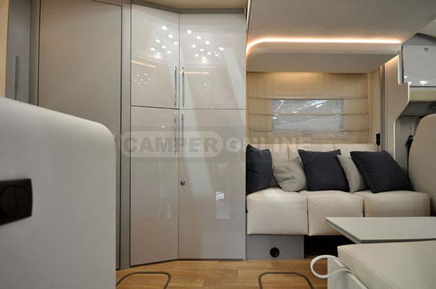 La novità 2017 CI e Roller Team si segnala innanzitutto per uno spazio living estremamente ampio e flessibile, dove tutti gli elementi sono trasformabili: tavolo, letto e divano. In particolare, quest’ultimo si trasforma in letto matrimoniale tramite un meccanismo di sollevamento manuale semplice e rapido, tipico dei divani domestici. I colori degli interni e le finiture dei materiali giocano sui toni chiari di tendenza rendendo gli ambienti più luminosi e tra le dotazioni si segnala il frigorifero a compressore da 165 litri che offre performance assimilabili al frigorifero i casa. Da segnalare infine l’uso di materiali innovativi con piani di tavolo, cucina e toilette realizzati in Fenix, un materiale che, sfruttando le nanotecnologie, assicura proprietà antibatteriche, resistenza ed eventuale facilità di riparazione in caso di necessità.