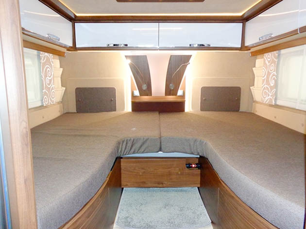 Anche in questo caso, si tratta di una veicolo che privilegia il lusso e l’abitabilità, con la zona notte posteriore configurata con la soluzione dei letti gemelli, ampia toilette passante con caratteristiche domestiche negli spazi e nelle dotazioni e soggiorno con dinette a “L” e divano laterale.