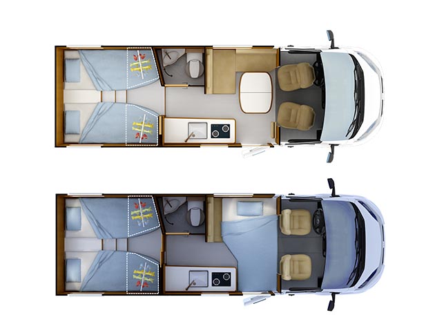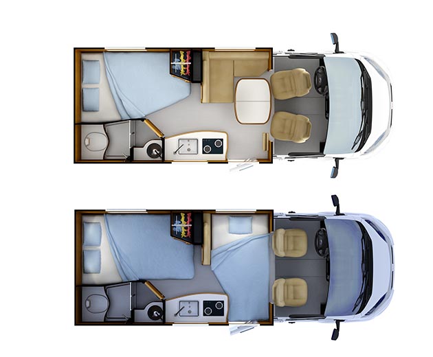 599 cm presenta la classica pianta con letto alla francese affiancato dal vano toilette, cucina lineare con frigo a compressore da 90 litri e dinette a “L” con tavolo ampliabile a libro, couadiuvata da uno strapuntino ribaltabile laterale che consente di ospitare un quinto commensale.