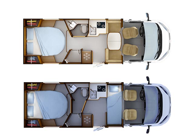 Rapido C 55 propone la zona notte con letti gemelli su gavone garage ed è dotato di una inedita toilette