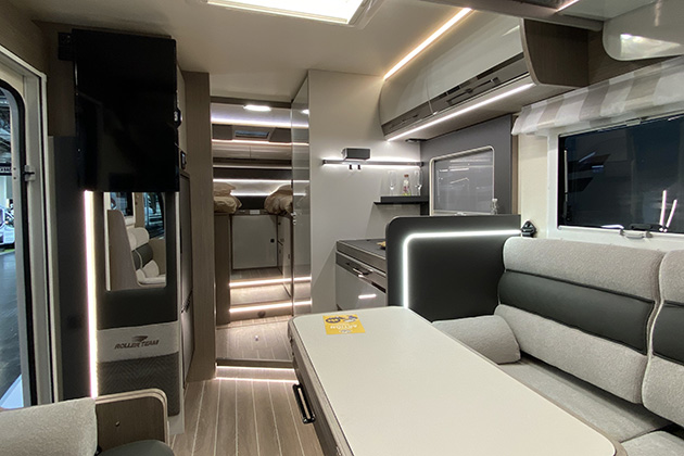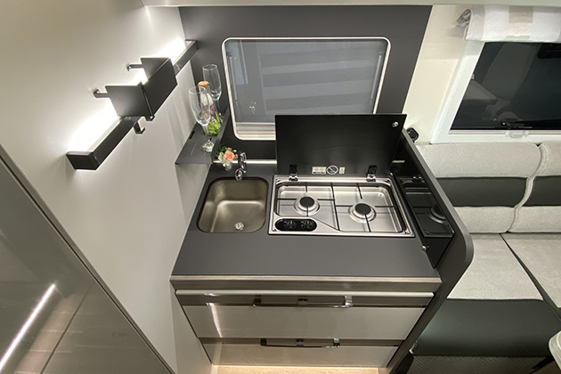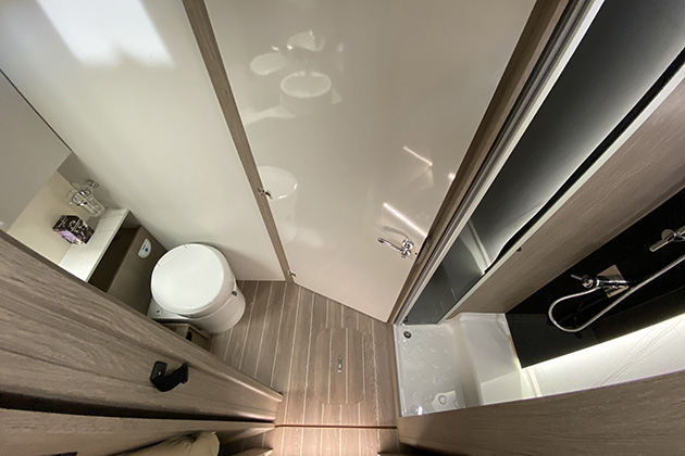 La cucina prosegue sulla linea di uno dei divani e offre un inedito piano cottura a due fuochi (ben spaziati) e un frigorifero a compressore a doppia anta da 158 litri di capacità. Molto simile, sui due modelli, anche la zona bagno, con la cabina doccia separata dal vano toilette, in modo da offrire la massima flessibilità d’uso.