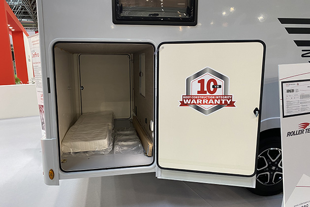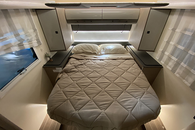 Zefiro 267 Integral offre il letto matrimoniale centrale con gli armadi a fianco della testiera. Su entrambi i modelli, parte dello spazio sotto ai letti è utilizzato per ricavare il vano garage.