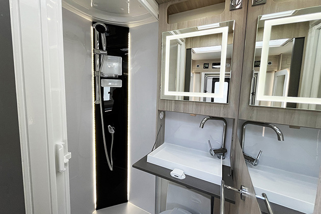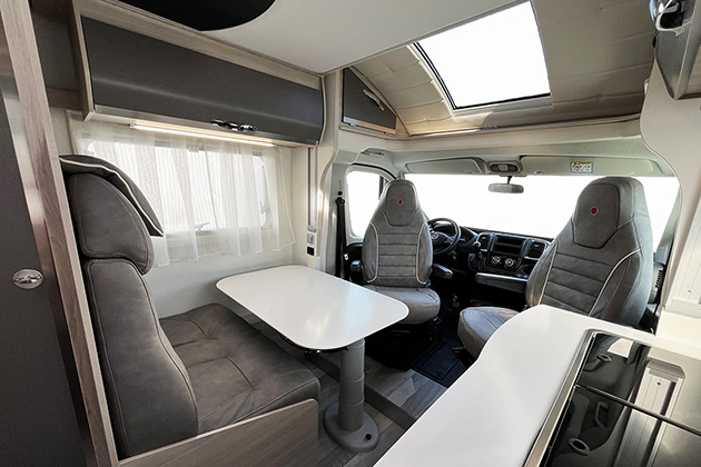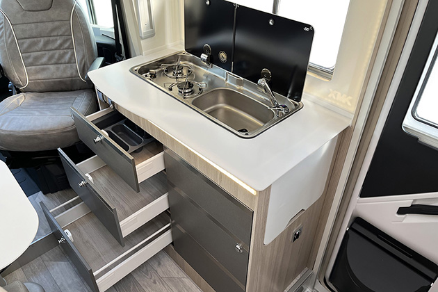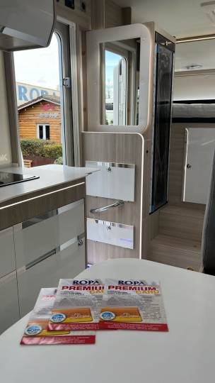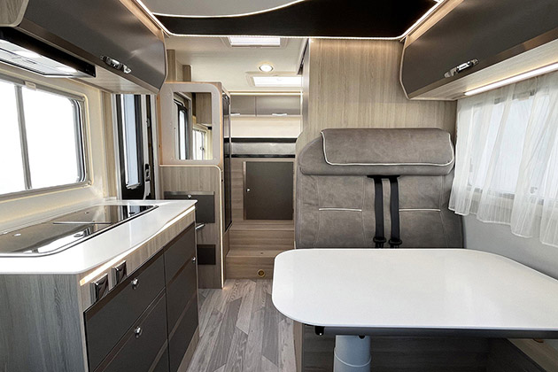 Per ottimizzare gli spazi è stato adottato un bagno con lavabo a scomparsa, che consente anche di ottenere un vano doccia di buone dimensioni. La cucina è ben fatta e si fa notare per il piano superiore in Krion, materiale di pregio, composto da minerali e resine, caldo al tatto, resistente e facilmente pulibile. La cucina viene completata da un frigorifero di grande capacità, con anta a doppia cerniera per l’apertura nei due sensi. In sostanza, questo mezzo vanta un arredo di qualità e interessanti soluzioni funzionali.