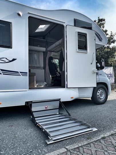 da oltre 15 anni a misura di portatori di disabilità. Un autocaravan studiato e progettato per facilitare il movimento della carrozzina delle persone con disabilità. Come la porta di ingresso maggiorata, servizi igienici ampi e senza barriere, la pedana meccanica con
