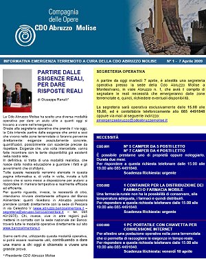 L’organizzazione che ci ha interpellato è la Compagnia delle Opere Adriatico (Abruzzo Molise), con sede a Montesilvano (tel 085 44791848) codice fiscale 91067180686. Il presidente è il Dott.Giuseppe Ranalli email: emergenzaabruzzo@cdoabruzzomolise.it