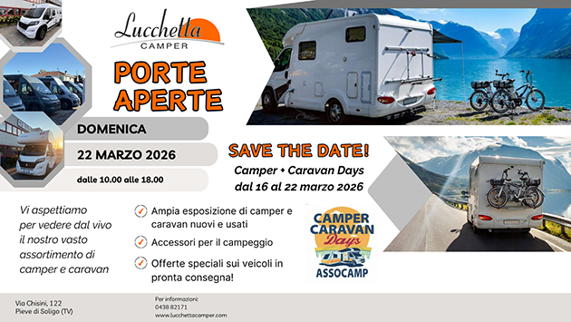 L’appuntamento è quindi a Pieve di Soligo (TV) presso la sede di Lucchetta Camper in Via Chisini 122, sabato 21 e domenica 22 marzo. Per maggiori informazioni: