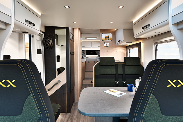Cliff X è dotato di finestre a filo carrozzeria con telaio integrato e di un'elegante illuminazione ambientale a LED sopra i pensili. Il