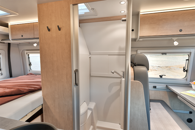 Cliff X offre anche pratiche possibilità di stivaggio nella parte posteriore, grazie al ripiano sopra al letto. Ma un altro elemento importante è il nuovo bagno con parete girevole per creare il vano doccia.