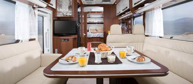 Superattico con mansarda: il Palace Alkoven rappresenta la visione del mansardato secondo MORELO Reisemobile GmbH. Dedicato a chi esige il massimo in termini di spazio (lunghezze tra 8.6 e 11.2 metri), di meccaniche di base (Iveco EuroCargo o M.A.N. TGL da 7.5 a 12 tonnellate), di impiantistica (doppio pavimento, serbatoi da 370 litri...) e di possibilità di carico (garage posteriori per moto, Smart ForTwo o Fiat 500), è proposto in sei varianti capaci di replicare (e a volte superare) il comfort di una normale abitazione. A cominciare dal salotto che, sviluppato a G, può tranquillamente ospitare anche 10 persone.