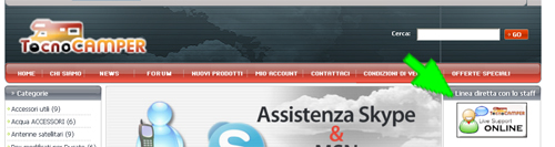 Si ricorda, inoltre, che contattare Tecnocamper è molto semplice e gratuito: è stato infatti attivato un nuovo servizio interattivo, nell'ottica di offrire al cliente/utente la possibilità, ove necessario, di poter entrare in contatto in modo semplice e rapido. Alle già presenti modalità di comunicazione (email, telefono, MSN e Skype), è stata aggiunta la linea diretta con lo staff, accessibile direttamente dalla Home Page del sito cliccando sull'icona in alto a destra come evidenziato dalla freccia: