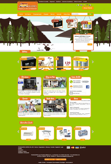 La grafica nuova segna una svolta con il passato.... abbandonati gli stili freddi che spesso caratterizzano i siti e-commerce, tecnocamper.com adotta una grafica allegra, leggera e coerente al settore in cui opera: vacanze e divertimento. Nella Home Page sono presenti 4 maxibanner che introduco alle specifiche sezioni del sito... per una navigabilità più facilitata.
