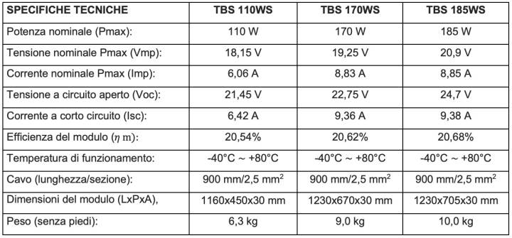 - TBS 185WS. Ha un’efficienza del modulo del 20,6%, una dimensione di 1.230x705x30 mm e un peso (senza piedi) di 10 kg.