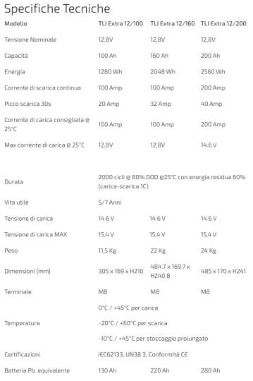 Le batterie TLI Extra sono equipaggiate con un “Battery Management System” (BMS) interno di grande affidabilità. Il BMS garantisce sicurezza ed efficienza della batteria, monitorando la temperatura dell’elettronica e delle celle e controllando la tensione di ogni singola cella per ottenere il migliore bilanciamento. La serie TLI Extra offre tre modelli TLI EXTRA 12/100 da 100 Ah e TLI EXTRA 12/160 da 160 Ah e TLI EXTRA 12/200 da 200 Ah.