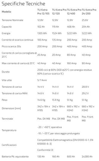 Le batterie TLI Extra Pro (professionali) si distinguono dalle altre batterie al litio presenti sul mercato per l’elevata densità di energia: a parità di peso e dimensione immagazzinano una quantità di energia molto più elevata. Le batterie TLI Extra racchiudono al loro interno un sofisticato “Battery Management System” (BMS) che gestisce la tensione di ogni singola cella, sia in fase di ricarica che in fase di scarica, aumentandone la durata di vita. Il BMS garantisce anche la protezione da guasti dovuti ad alte temperature, sovraccarichi e scariche troppo profonde.