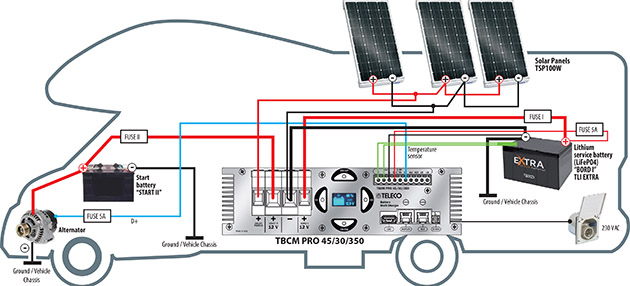 Il caricabatterie TBCM PRO 45/30/350 è compatibile sia con CI-BUS, il sistema di trasmissione dati sviluppato su una piattaforma comune dall’industria del caravanning europea, sia con Teleco HUB. Nuove funzioni caratterizzano questa versione aggiornata. Citiamo ad esempio la funzione Bridge, utile se la batteria motore dovesse scaricarsi e non ci fosse la possibilità di ricaricarla con fonti convenzionali. Un relé esterno (optional) permette di prelevare corrente in maniera controllata dalla batteria di servizio e riversarla in quella motore: dopo alcuni minuti sarà possibile rimettere in moto il motore. Interessante anche la possibilità di attivare il condizionatore d’aria quando il veicolo è in marcia. I condizionatori Teleco/Telair possono funzionare anche durante la marcia prelevando l’energia dalle batterie, ma TBCM PRO 45/30/350 entra in protezione al superamento dei 45 A di assorbimento. Un apposito relé (optional) mette in relazione diretta il condizionatore con l’alternatore del veicolo e permette alla corrente di transitare direttamente per alimentare il sistema di climatizzazione durante la marcia.