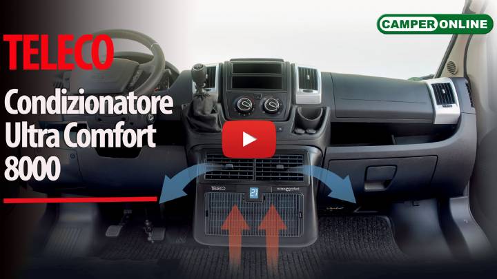 Teleco ha lanciato sul mercato la versione potenziata del condizionatore Ultra Comfort: si chiama Ultra Comfort 8000 e ha una capacità di raffrescamento adeguata a camper fino a 7 metri e mezzo di lunghezza. Questo rivoluzionario condizionatore non viene fissato sul tetto: il compressore è installato nel vano motore, mentre il diffusore d’aria è montato nella cabina di guida, sotto al cruscotto.Il nuovo Ultra Comfort 8000 offre anche un’opzione esclusiva di sterilizzazione dell’aria e abbattimento degli odori, con il sistema brevettato SterilAir Pro.