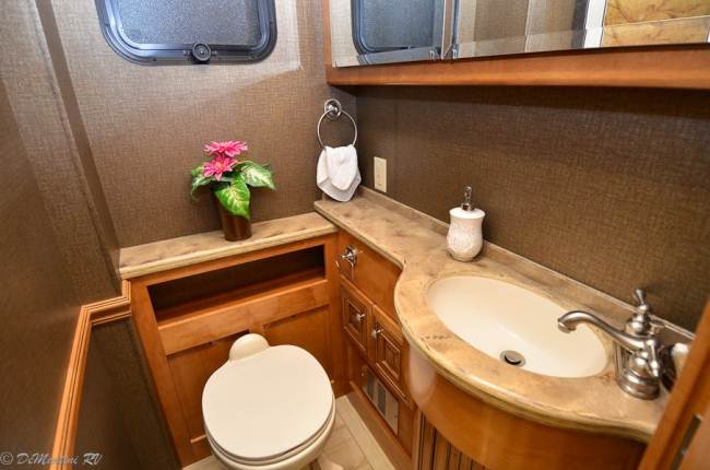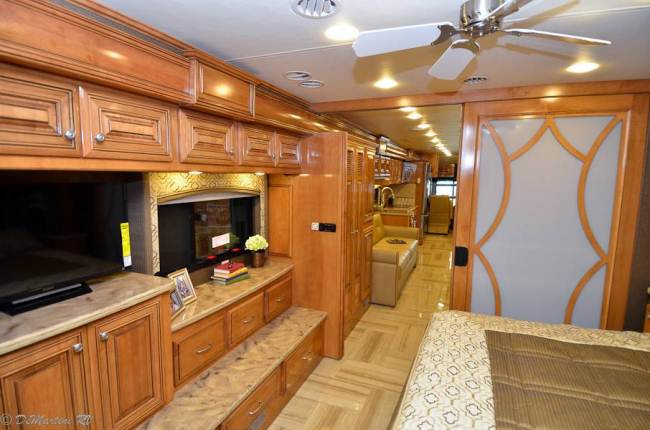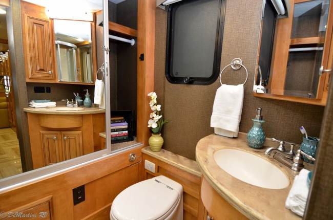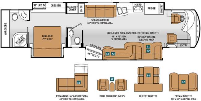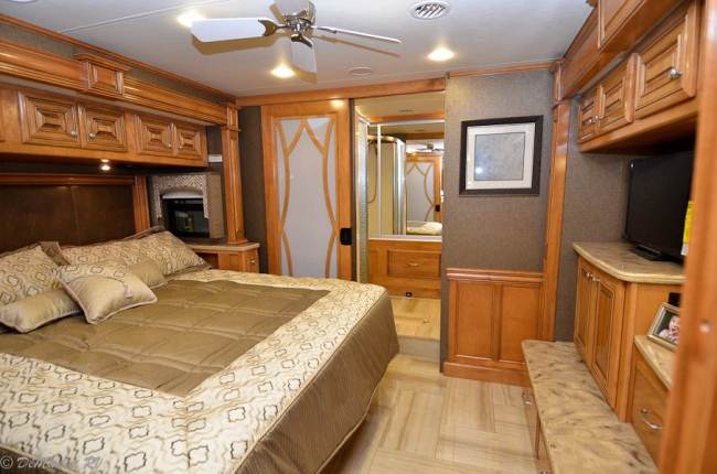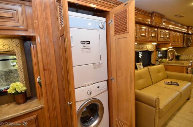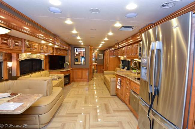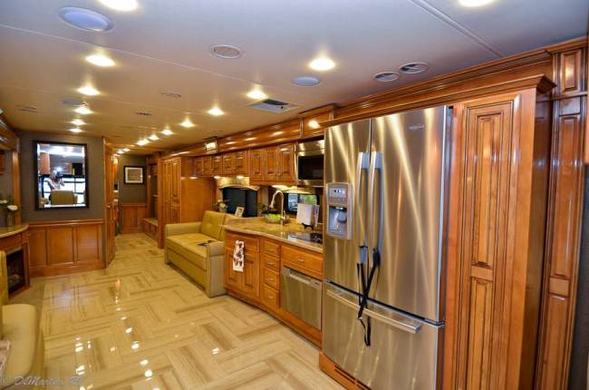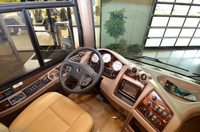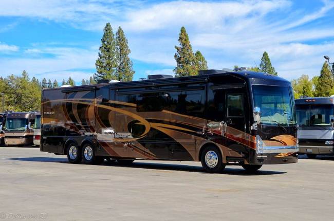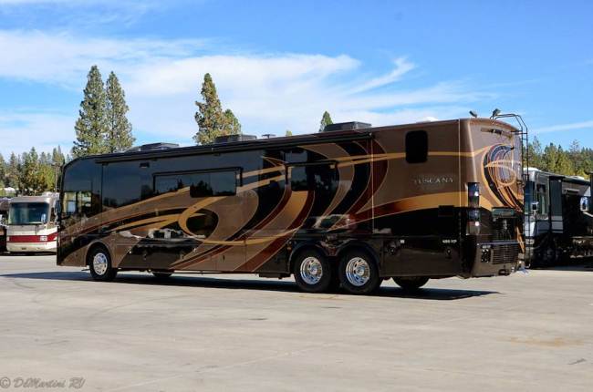 Lavapiatti, lavatrice, asciugatrice, maxi-frigo con ghiacciaia, slide-out su entrambe le pareti, pavimento in marmo, doppi servizi, doppia aria condizionata, generatore Onan da 10kW, telaio Freightliner e motorizzazione Cummins Diesel da 450 cv abbinata a un cambio automatico Allison, tre assi e, naturalmente, tutto quello che si può desiderare a bordo di una casa viaggiante: con 13 metri e mezzo di lunghezza, il Tuscany 44MT è l'ammiraglia della produzione Thor Motor Coach