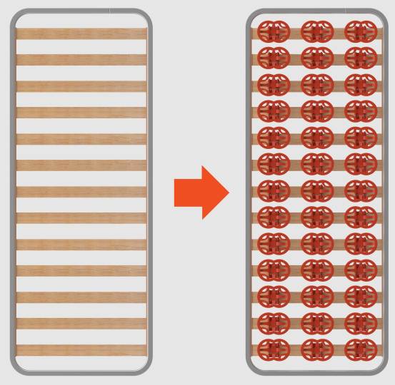 Il cuore del sistema è rappresentato da sospensioni in tecnopolimero regolabili in altezza, progettate per offrire un supporto ergonomico ottimale alla schiena e, allo stesso tempo, garantire una ventilazione efficace del materasso. Le sospensioni possono essere installate facilmente sulle tradizionali reti a doghe, senza necessità di attrezzi, grazie a un sistema di fissaggio rapido e intuitivo.