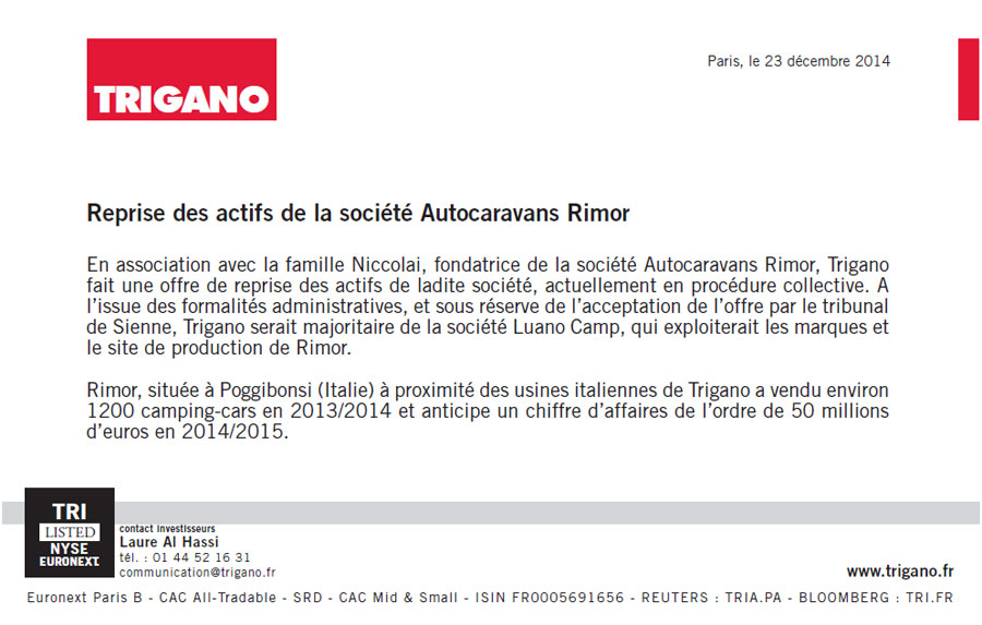 In collaborazione con la famiglia Niccolai, fondatrice della società Autocaravans Rimor, Trigano formula un'offerta di acquisizione delle attività della società, attualmente in procedura fallimentare.