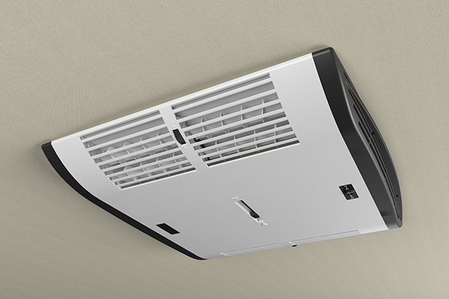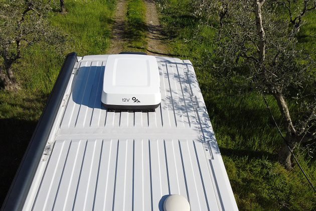 Lo scopo di questo condizionatore è quello di raffrescare e deumidificare principalmente la zona posteriore dell’abitacolo, dove è collocato il letto, così da garantire un clima ottimale durante le ore di riposo. Non avendo il compito di condizionare tutto l’abitacolo, questo apparecchio ha una potenza di 1200 W, in modo tale da contenere l’assorbimento di elettricità e consentire il funzionamento in autonomia con la sola batteria, senza allacciamento alla rete esterna. Stiamo comunque parlando di un vero e proprio condizionatore, che funziona a 12 Volt con compressore a corrente continua e non prevede l’utilizzo di un inverter, che innalzerebbe i consumi.