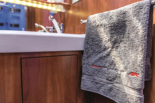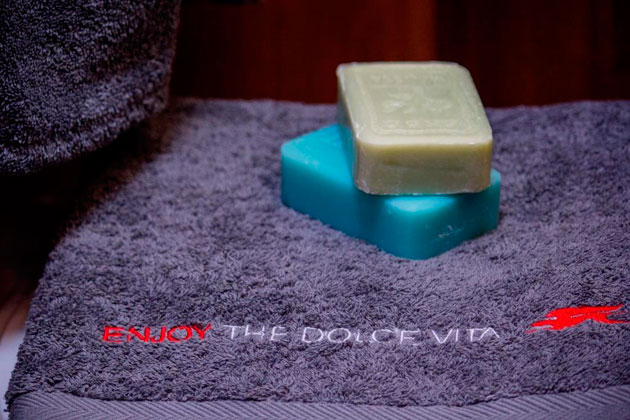 il bagno è disponibile la coppia di asciugamani di diverso formato e il comodo accappatoio, tutti personalizzati con il logo Laika ricamato, perché lo stile, anche in viaggio, si vede dai dettagli.