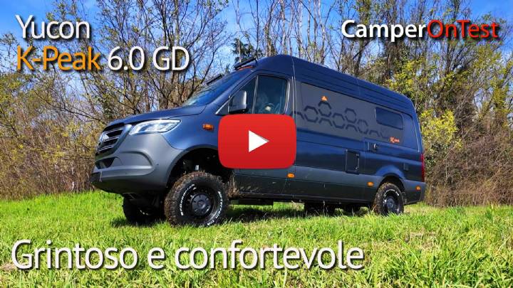 Abbiamo saggiato le doti dello Yucon K-Peak 6.0 GD,un camper 4x4 apparso di recente sul mercato: recepisce l’esperienza della casa madre Frankia e mette in campo soluzioni particolari. È’ un van che punta in alto, è destinato a chi vuole un prodotto singolare, che sappia attirare gli sguardi e nello stesso tempo riesca a soddisfare una grande sete di libertà. E’ allestito sulla versione a trazione integrale della meccanica Mercedes-Benz Sprinter. Del tutto inconsueta è la proposta, su un van Mercedes sotto ai 6 metri, dei comodi letti singoli posteriori. Questo camper non passa inosservato, è grintoso, l’immagine esterna è accattivante. Perché, siamo sinceri, chi cerca un mezzo 4x4 non lo fa solo per avere una meccanica off-road, ma anche per farsi notare con un prodotto diverso dal solito. E per completare il quadro, ecco un’impiantistica pensata per assicurare autonomia in sosta libera.