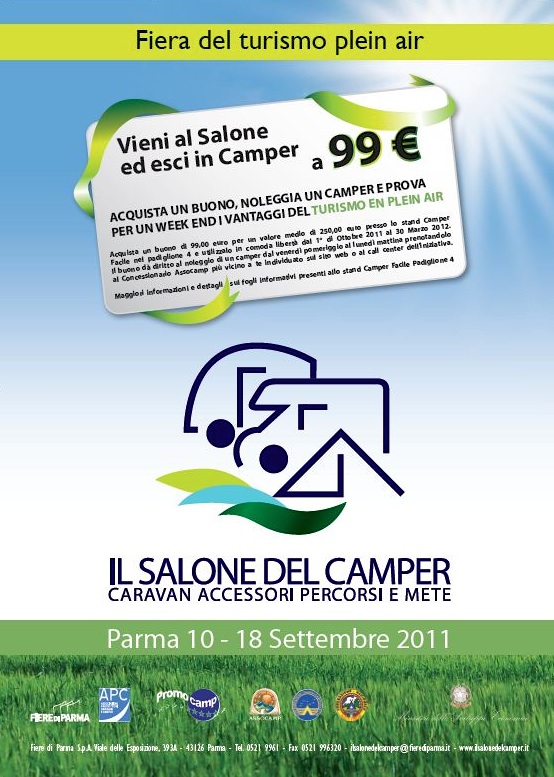 Grazie alla fattiva collaborazione tra APC – ANFIA, Fiere di Parma e Assocamp, Associazione Nazionale Operatori Veicoli Ricreazionali e Articoli per il Campeggio, al Salone del Camper 2011 saranno a disposizione del pubblico 1.000 voucher per un week end in camper a 99 euro ognuno.