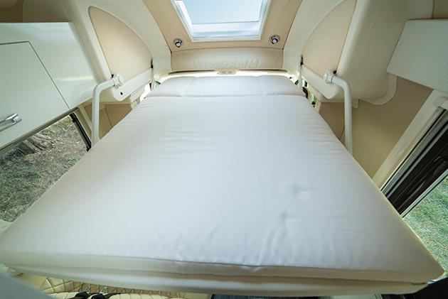 Non manca, ovviamente, il praticissimo letto basculante longitudinale brevettato Wingamm, ampio nelle dimensioni e facilissimo da porre manualmente in opera, che porta a quattro i posti letto sempre disponibili, facendo si che questo nuovo semintegrale si pinga non solo come ideale per la coppia, ma anche indicato per la famiglia.