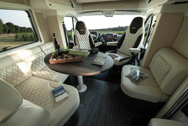 L’allestimento prevede una soggiorno con ampia dinette a “L” e tavolo traslabile, coadiuvata da un poltroncina laterale. La cucina lineare, propone un top in laminato HPL con lavello realizzato in vetroresina ed è completo di piano cottura a 2 fuochi e frigorifero trivalente, mentre il bagno, realizzato in vetroresina, propone un ampio lavello ed è provvisto di box doccia separabile con porta rigida.
