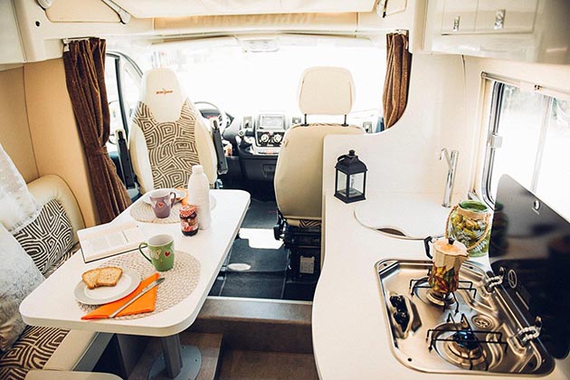 Il blocco cucina si sviluppa subito a destra sino al sedile passeggero, completo di piano cottura a 2 fuochi con coperchio filo-top e frigorifero trivalente da 96 Lt. Di fronte alla cucina, c’è la doppia dinette a cui segue il vano toilette realizzato in vetroresina con lavello di ampie dimensioni, l’angolo doccia separato con asta doccia e Wc in ceramica.
