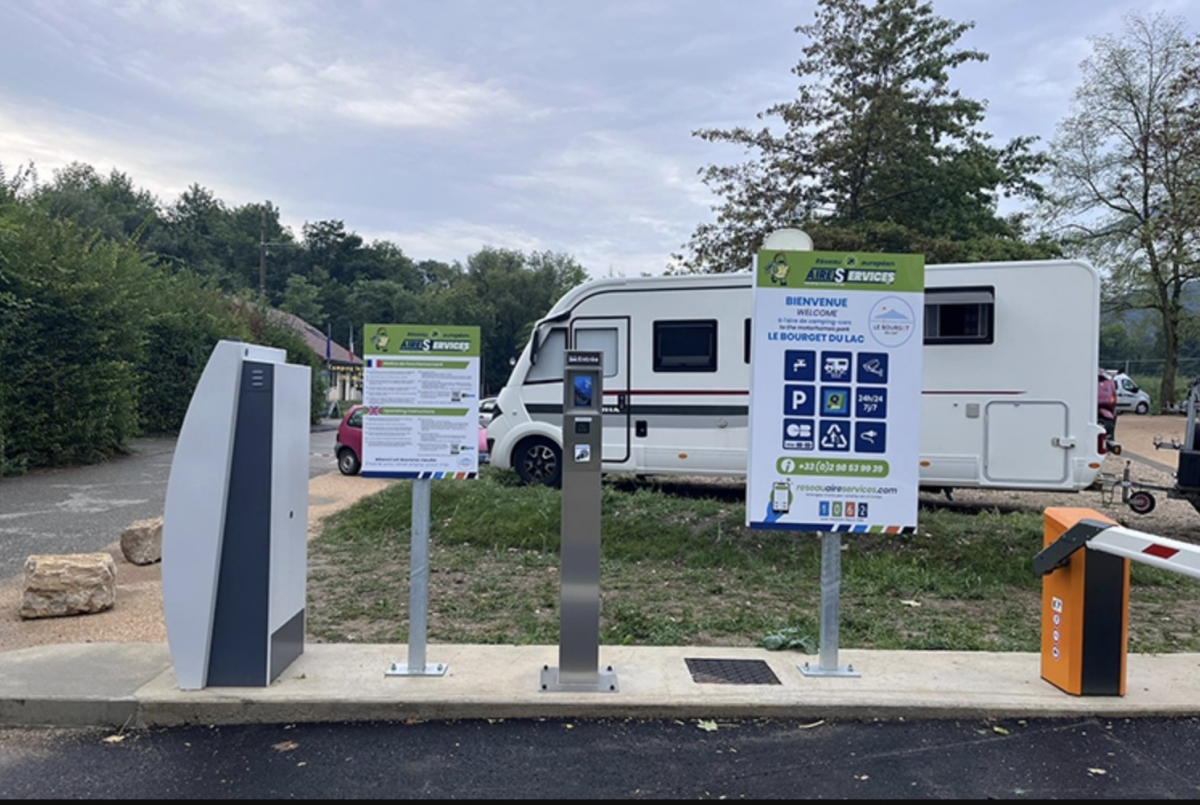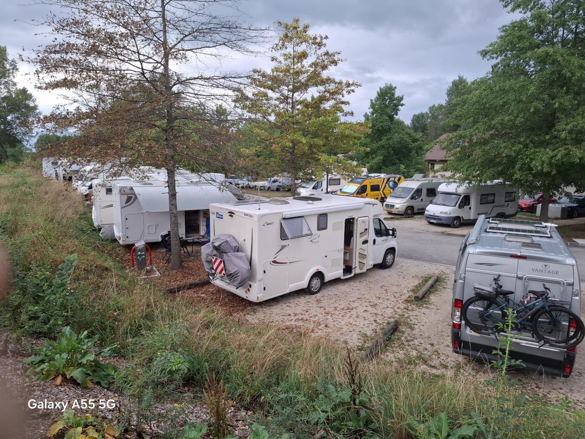 Vicina al lago e al centro, area camper comunale con sbarra accesso e pagamento automatizzato, adiacente al campeggio International de l'Ile con cui � convenzionata per spiaggia e servizi, 30 piazzole delimitate da tronchi di legno e 28 prese di corrente da 10A.
