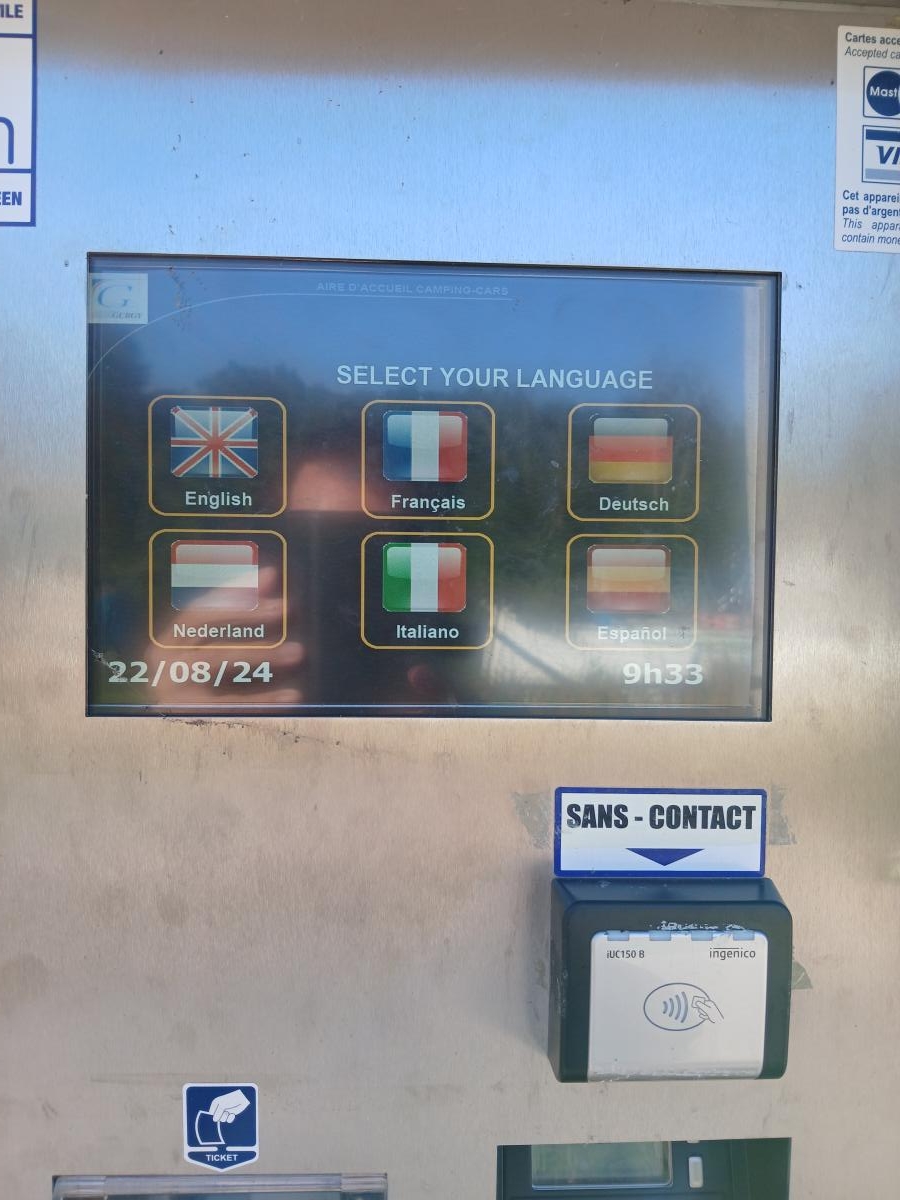 Lungo fiume Yonne e adiacente al piccolo villaggio, area camper con accesso automatizzato, a pagamento con carte, 24 stalli, allaccio elettrico e carico/scarico, piccolo chiosco con cibi e bevande