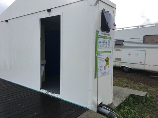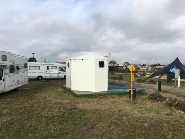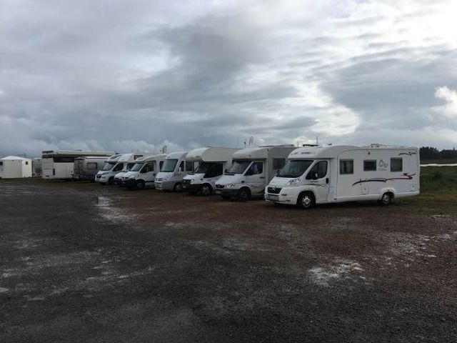 Ampio spazio riservato a sosta camper, livellato, in parte su asfalto e in parte su stabilizzato, presso impianti sportivi e acquatici, panoramico. Presente blocco servizi.