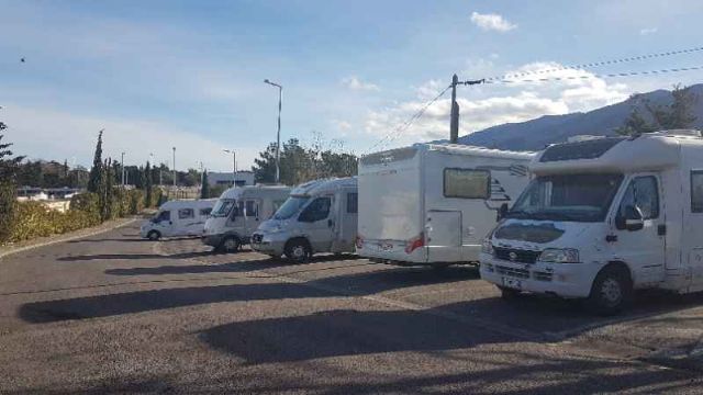 Abbastanza frequentata, tranquilla, gratuita, non in piano - sono necessari i cunei, scarico gratuito, acqua 2 euro per 5 minuti di erogazione (un po' più di 100l)